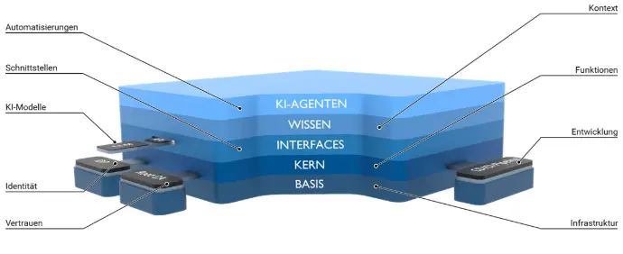Die Plattform stellt zentrale Core- und Essential-Services für Betrieb, Governance und Wissensnutzung bereit und reduziert damit technische Komplexität und Integrationsaufwand. - Modularer und individuell anpassbarer Aufbau